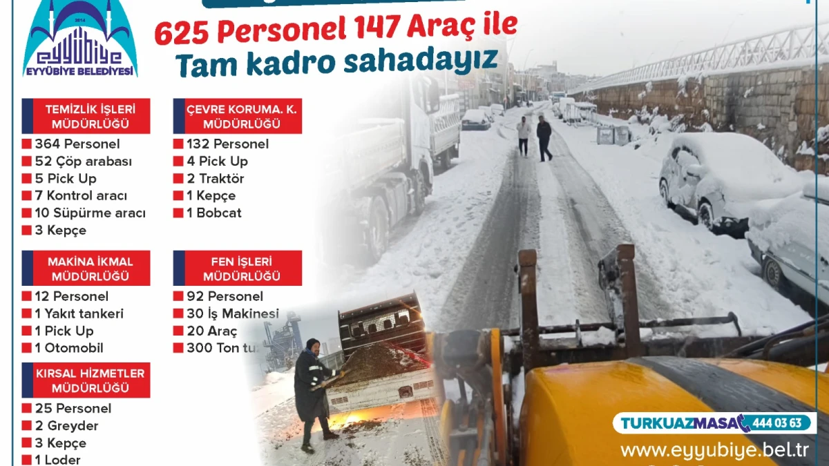 Kar yağışının olumsuz etkilerini bertaraf etmek için olağanüstü bir çalışma sergileyen Eyyübiye Belediyesi ekipleri, olumsuz hava koşulları sona erene kadar çalışmalarını aralıksız sürdürecek.